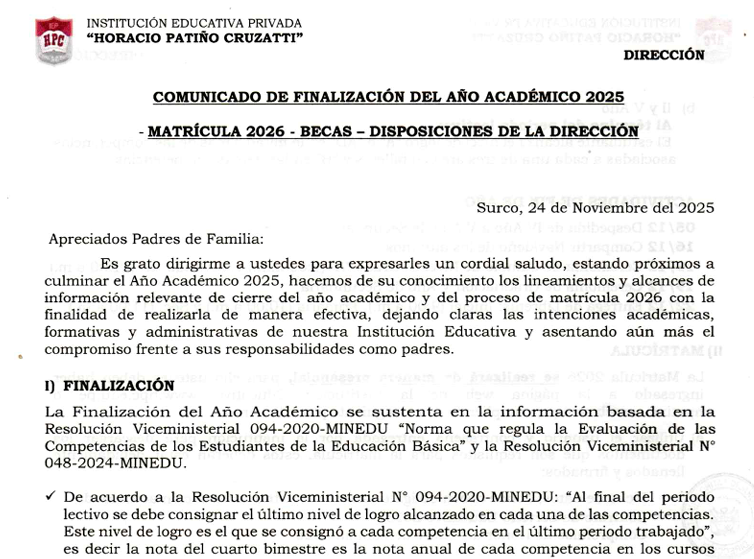 Expresándoles mi cordial saludo se les hace conocer, que ante los hechos suscitados en la ciudad de Lima y lo dispuesto en el COMUNICADO N° 009-DRELM, esta dirección ha dispuesto que se realice el trabajo remoto en nuestra IEP. Horacio Patiño Cruzatti así como las clases virtuales el día de mañana lunes 6 de Octubre en su horario normal.