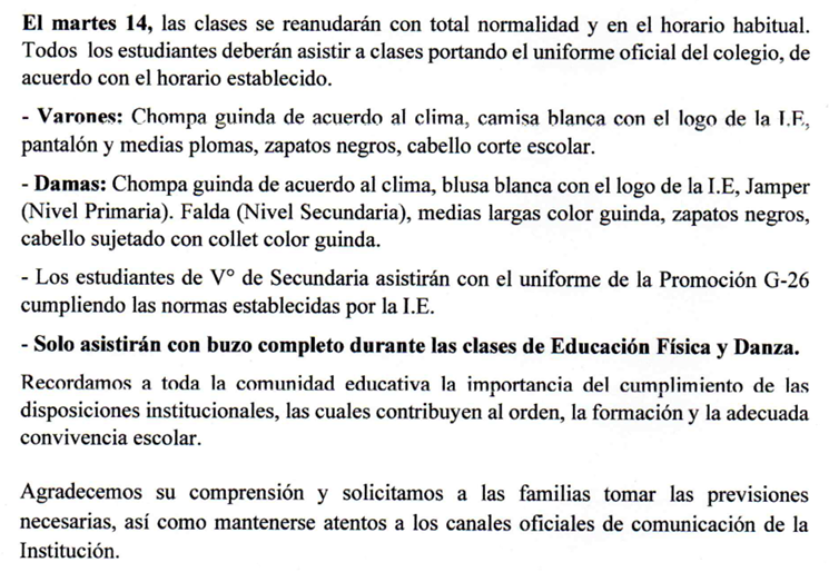 Expresándoles mi cordial saludo se les hace conocer, que ante los hechos suscitados en la ciudad de Lima el día de hoy, esta dirección ha dispuesto que se continúen con las clases virtuales el día de mañana viernes 11 de Octubre en su horario normal. Así mismo se les comunica que a partir del día sábado 12 del presente podrán vía SieWeb visibilizar las libretas de notas de sus menores hijos y recogerlas físicamente desde el lunes 14 en el horario de 08.30 a 13.00 horas en la Institución Educativa.